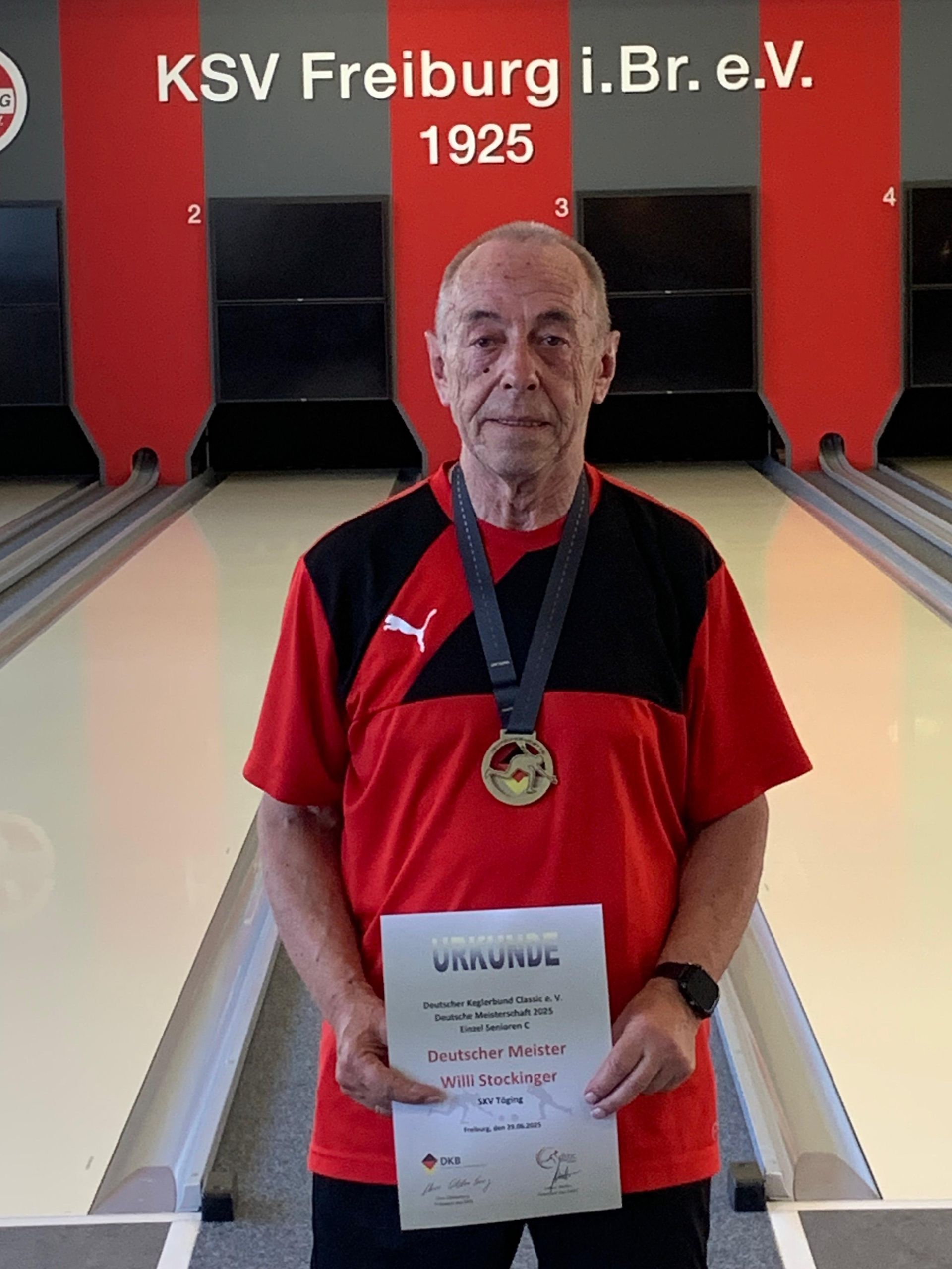 Am 28. und 29. Juni 2025 fanden die Deutschen Meisterschaften der Senioren im Kegeln statt. Dabei traten die 20 besten Keglerinnen und Kegler der Altersklassen ab 50 Jahren in Freiburg gegeneinander an. Als amtierender Bayrischer Meister der Senioren C qualifizierte sich auch Willi Stockinger aus Töging. Im Vorlauf am Samstag überzeugte Stockinger mit sehr guten 598 Kegel und belegte damit den ersten Platz mit 21 Kegel Vorsprung auf den Zweitplatzierten. Mit diesem Polster startete der Töginger am Sonntag Früh gegen seine Konkurrenz. Erneut spielte er den Tagesbestwert mit 574 Holz und setzte sich damit deutlich ab. Insgesamt erreichte Willi Stockinger damit sehr gute 1172 Kegel und wurde Deutscher Meister. Den zweiten Platz sicherte sich Rudolf-Henry Kuschmann vom ESV LOK Hoyerswerda (1121) vor Bernd Busch vom KSV Lobenstein (1098). Größten Respekt verdienen nicht nur die tollen Ergebnisse, sondern auch die körperlichen Leistungen aller Athleten, die an zwei aufeinanderfolgenden Tagen jeweils eine Stunde bei sommerlichen Temperaturen ihre Höchstleitung mit über 70 Jahren gebracht haben.